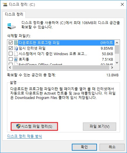 4) 디스크 정리 창이 뜨면 시스템 파일 정리 메뉴를 선택합니다.