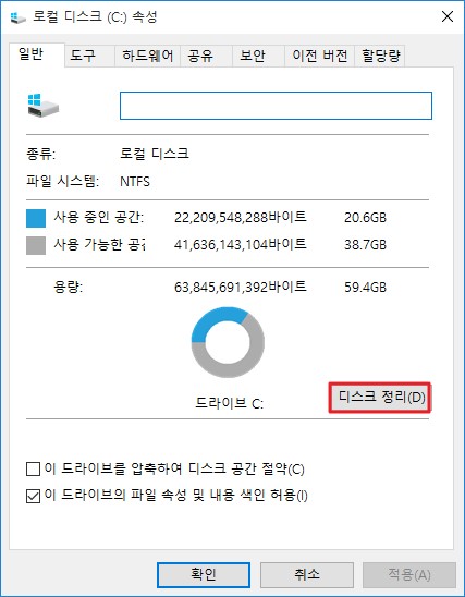 2) 그럼 현재 C 드라이브의 하드디스크 용량과 파일 시스템 등 모든 정보가 뜨는데 디스크 정리 메뉴를 선택합니다.