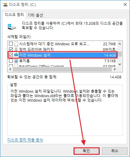 6) 삭제할 파일 목록중 이전 Windows 설치 를 체크 후 확인 버튼을 누릅니다.