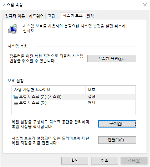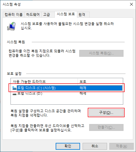 - 시스템 속성의 시스템 보호 탭에서 만들기가 비활성되어 있다면 보호설정 대상 드라이브를 선택하고 구성을 선택합니다.