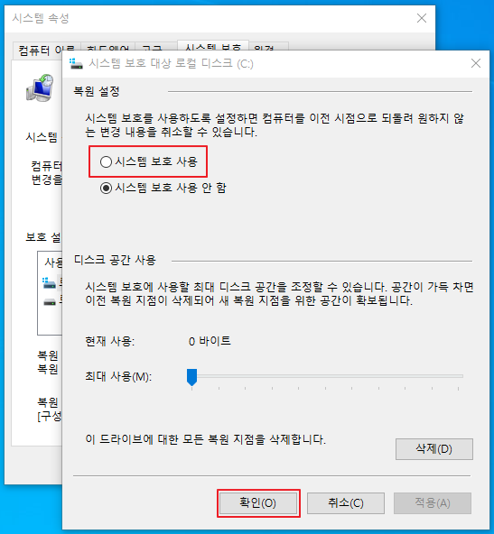 - 구성에서 복원 설정 - 시스템 보호 사용을 선택합니다.