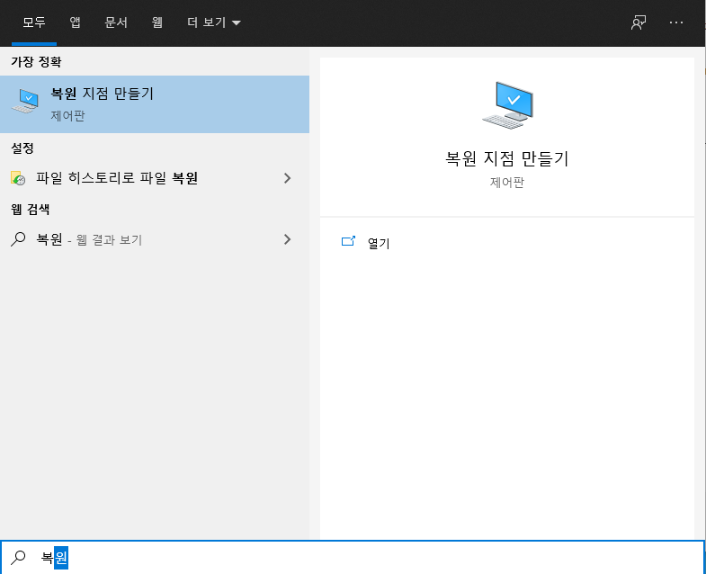 - 시작메뉴에서 복원 지점 만들기를 선택합니다.