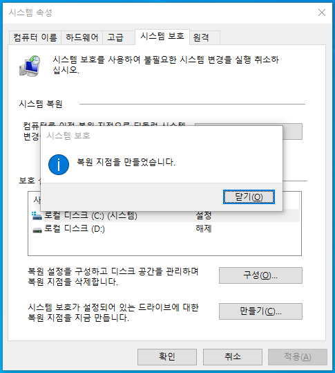 - 복원 지점이 만들어졌습니다.