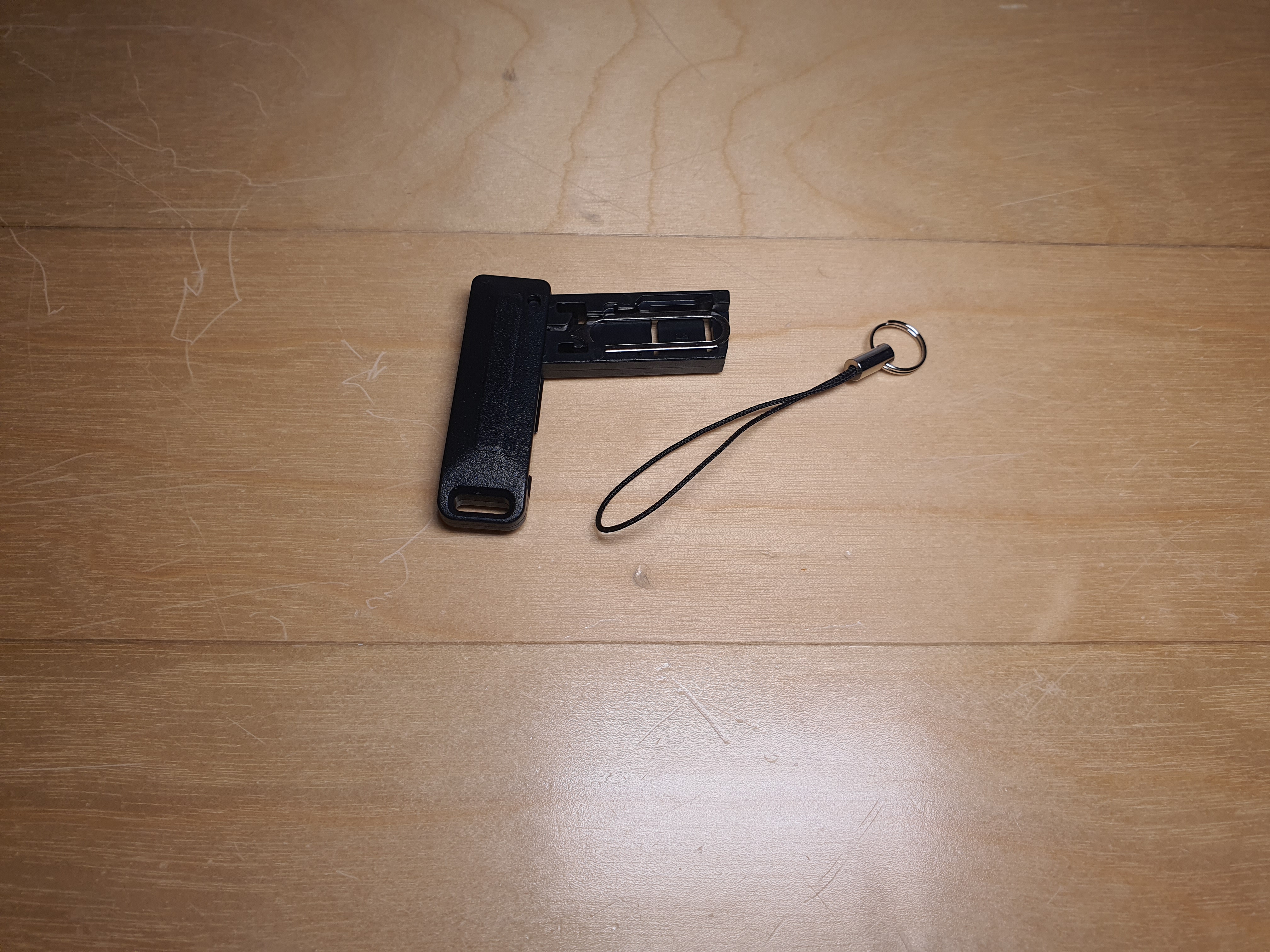 - 구성품은 본체, 분리 가능한 스트랩(키링 겸용), 그리고 SIM 이젝터 핀입니다.