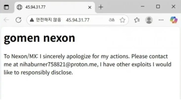 - 공격자가 공격에 활용했던 IP 주소로 접속하면 "고멘(미안) 넥슨"이라는 제목과 함께 "나에게 메일을 보내면 다른 취약점도 알려주겠다"라는 메시지가 노출되어, 추가적인 보안 취약점이 존재할 가능성을 시사하고 있습니다.