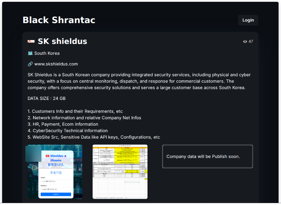 - 2025년 10월 16일, 다크웹에 신생 랜섬웨어 해커 그룹 '블랙쉬란택(Blackshrantac)'이 SK쉴더스 데이터 24GB를 탈취했다고 주장하며 시스템 구축 제안서, 시스템 구성, 솔루션 목록, 증명사진 및 진료 기록 등 개인정보를 담은 이미지 40여 개를 샘플로 공개했습니다.