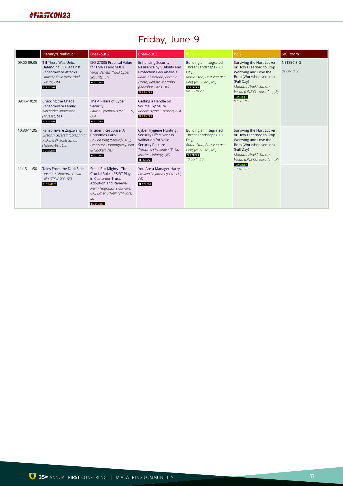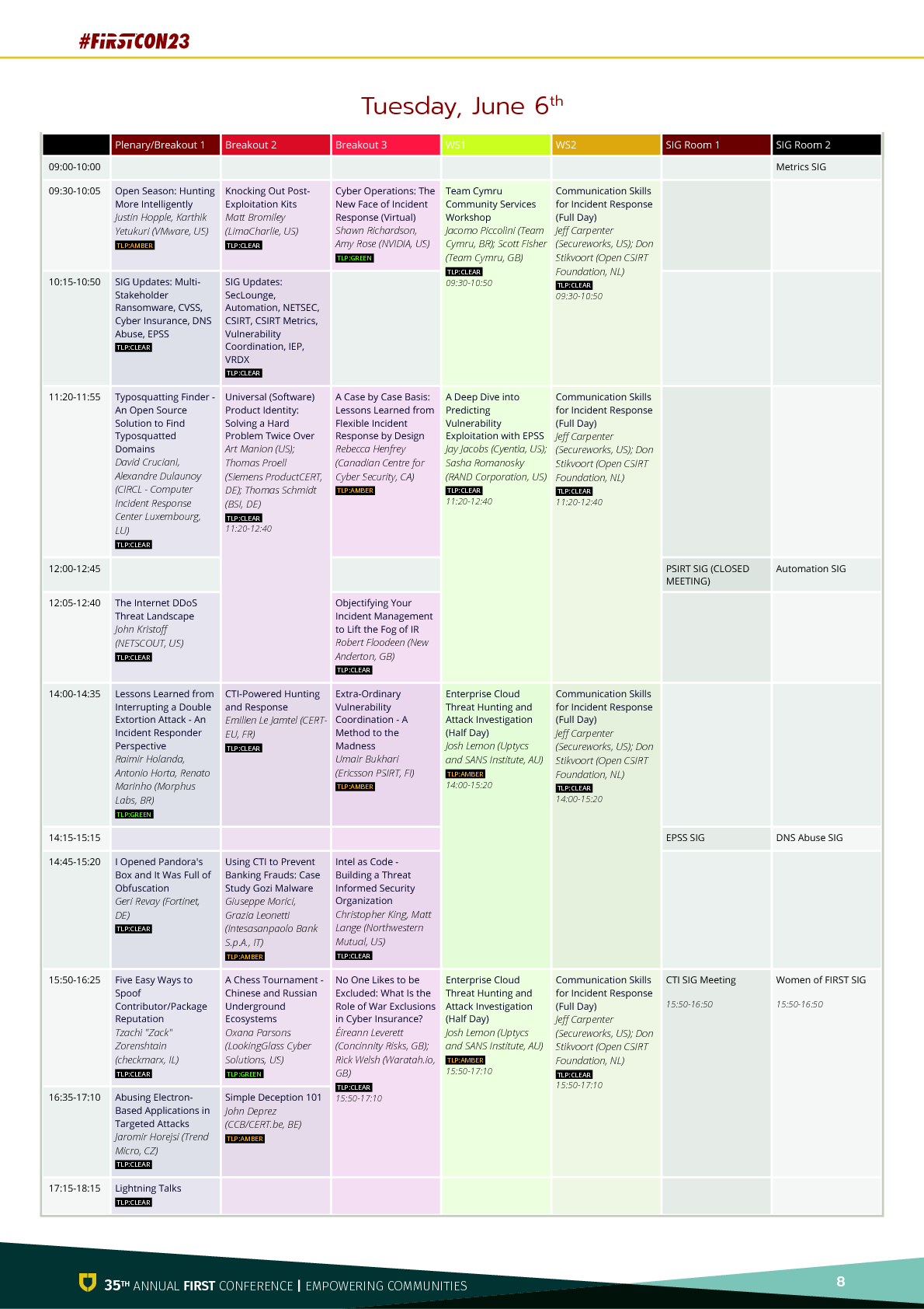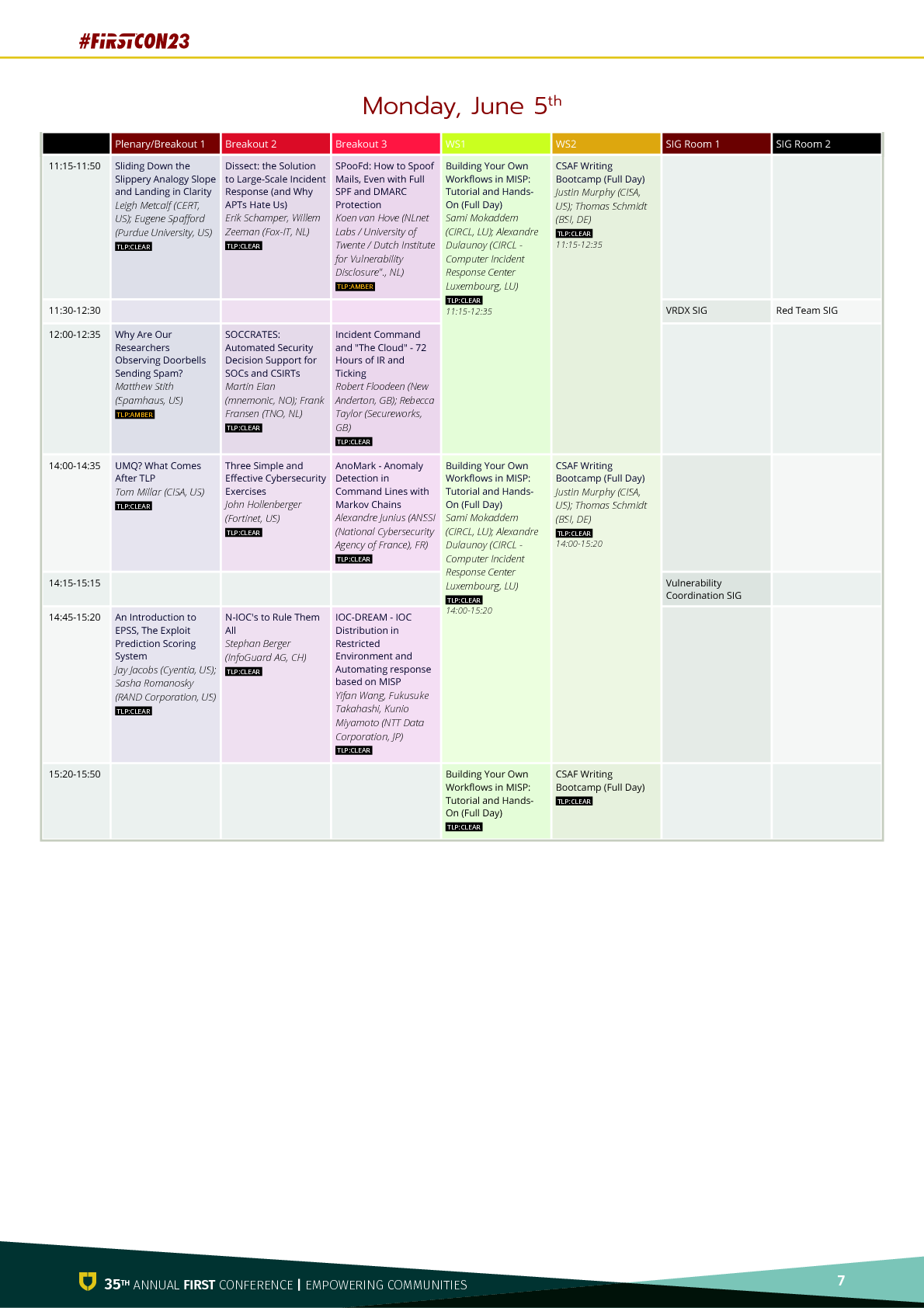 네트워크 트래픽 모니터링에서 랜섬웨어, 채용의 다양성에 이르기까지 중소기업, 대기업, 지역적 다양성, 폭넓은 주제에 대한 균형을 맞추는 등 FIRST의 다양성에 부합하는 프로그램을 채우는 것은 항상 어려운 과제입니다. 올해는 매우 다양하고 탄탄한 제안서 덕분에 수월하게 진행되었지만, 동시에 원하는 모든 것 을 프로그램에 포함시킬 수 없었기 때문에 도전적이기도 했습니다. (그리고 지난번 캐나다에 있을 때보다 거의 509개에 달하는 프레젠테이션과 워크샵이 준비되어 있습니다). 세 그룹의 사람들에게 개인적으로 감사를 표하고 싶습니다. 첫 번째는 2023의 매우 활발한 프로그램 위원회입니다. FIRST 커뮤니티에 대한 그들의 친숙함과 전문성은 우리가 훌륭한 프로그램을 구성하는데 핵심적인 역할을 했습니다. 다음으로, 해마다 연례 컨퍼런스의 성숙과 성장에 밑거름이 되는, 잘 알려지지 않은 이벤트 팀에게 감사를 표하고 싶습니다. 마지막으로 프레젠테이션을 제출해주신 모든 분들께 감사드립니다. 더 많은 분들을 선정할 수 있는 공간이 있었으면 좋았을 텐데요. 제 계산이 맞다면 27개 국가와 지역에서 발표를 진행했고, 그보다 더 많은 국가와 지역에서 발표를 제출한 것으로 알고 있습니다.