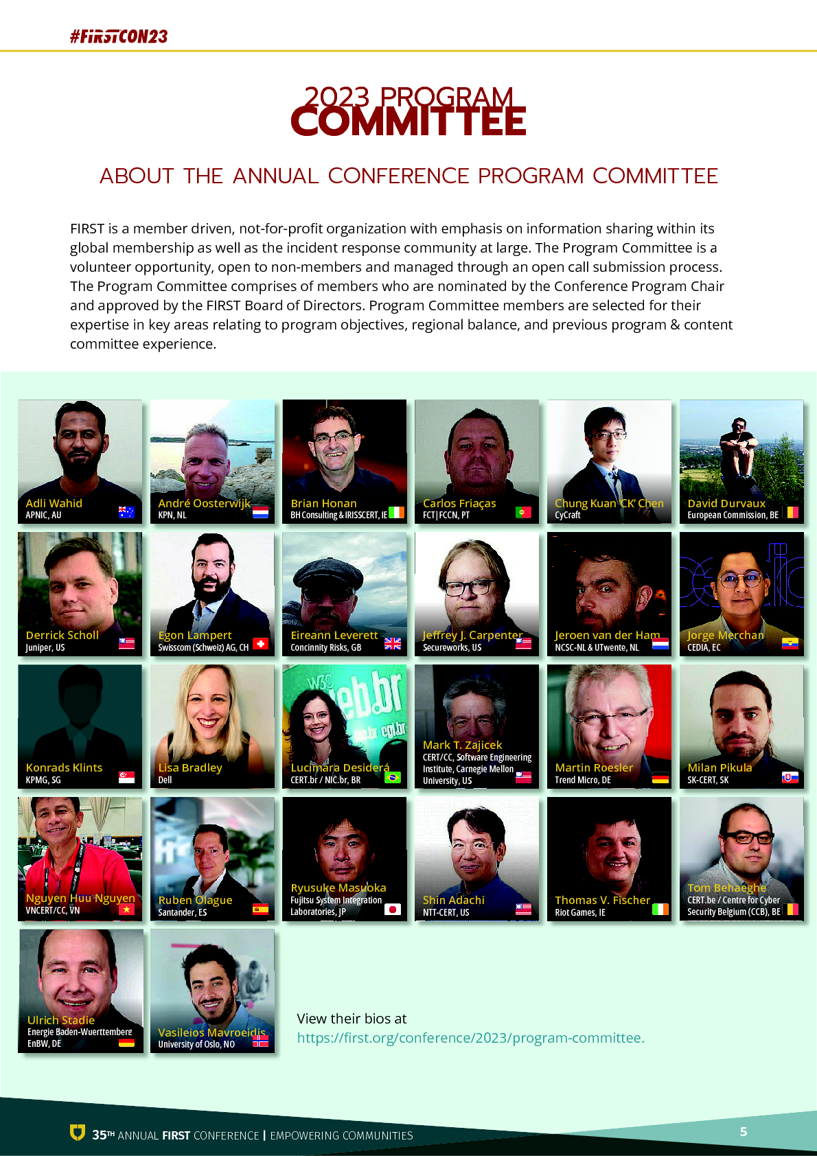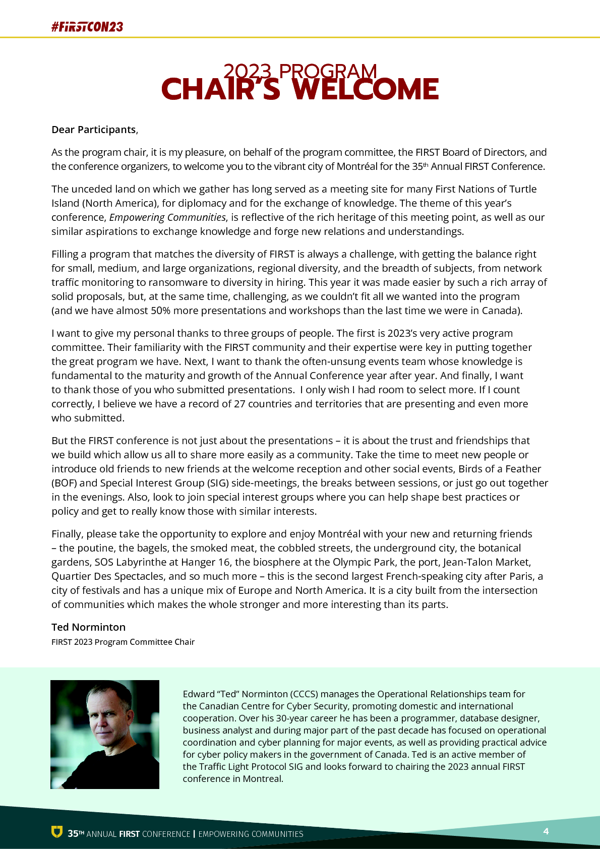 프로그램 위원장으로서 프로그램 위원회, FIRST 이사회 및 컨퍼런스 주최자를 대표하여 35회 연례 FIRST 컨퍼런스가 열리는 활기찬 도시 몬트리올에 오신 여러분을 환영하게 되어 기쁩니다.