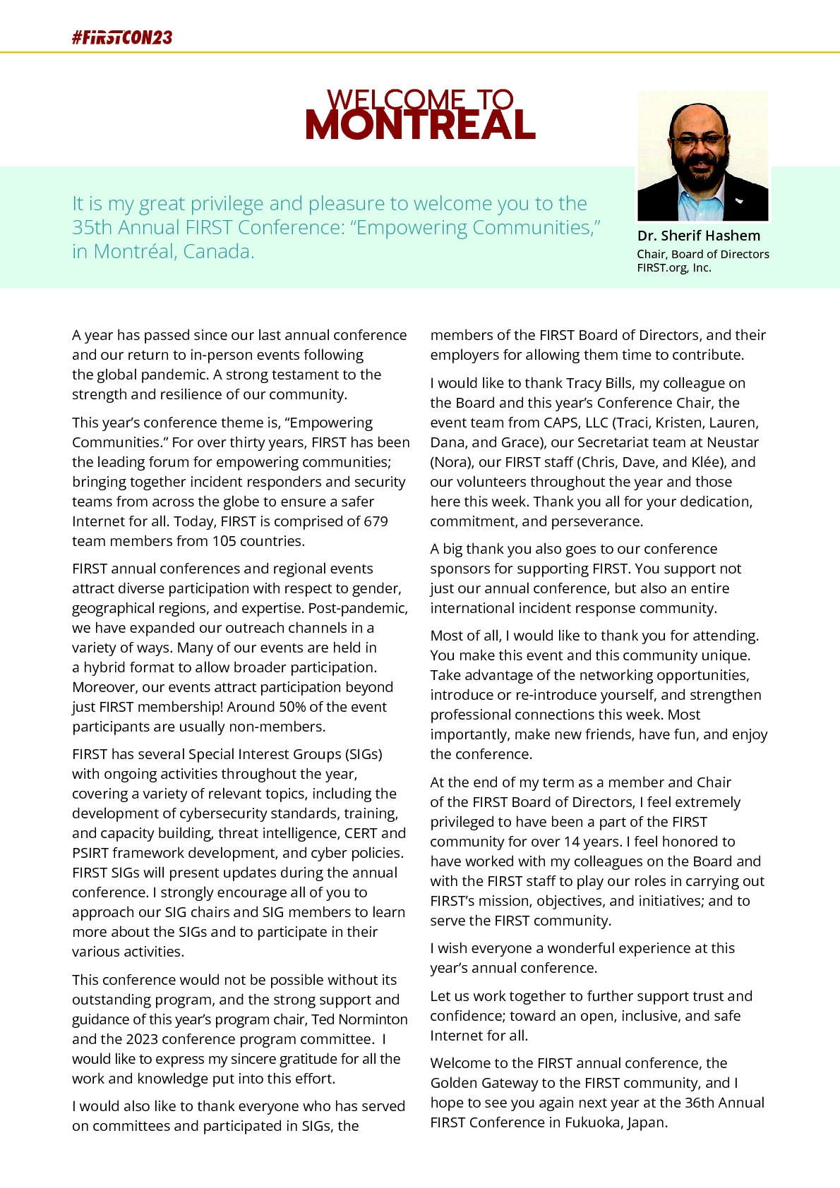 프로그램 위원장으로서 프로그램 위원회, FIRST 이사회 및 컨퍼런스 주최자를 대표하여 35회 연례 FIRST 컨퍼런스가 열리는 활기찬 도시 몬트리올에 오신 여러분을 환영하게 되어 기쁩니다.