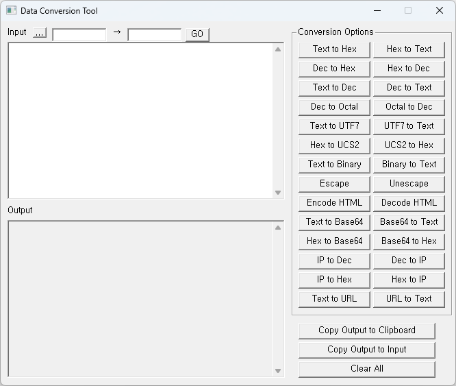 | switch (btnId) { case IDC_TEXT_TO_HEX: textToHex(input, output, MAX_BUFFER); break; case IDC_HEX_TO_TEXT: hexToText(input, output, MAX_BUFFER); break; // ... 등등 case IDC_TEXT_TO_BASE64: encodeBase64(input, output, MAX_BUFFER); break; case IDC_BASE64_TO_TEXT: decodeBase64(input, output, MAX_BUFFER); break; // ... } |