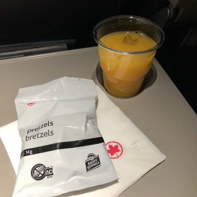 ◎ episode 5 Toronto(YYZ) -> Montreal(YUL)...국내선이라 그런지 밖으로 나가서 탑승했습니다. 비행기도 통로중심으로 좌우로 2명씩 의자네요. 맨 마지막에 탑승하다보니 제 자리 위쪽 선반은 자리가 꽉 차서 약간 뒤쪽 선반에 넣었습니다. 1시간 10분 거리이기 때문에 간단한 과자와 음료수를 줍니다. 오렌지쥬스는 마시고 과자는 안먹고 챙겼습니다.(사진을 안찍어서 퍼온사진입니다.)