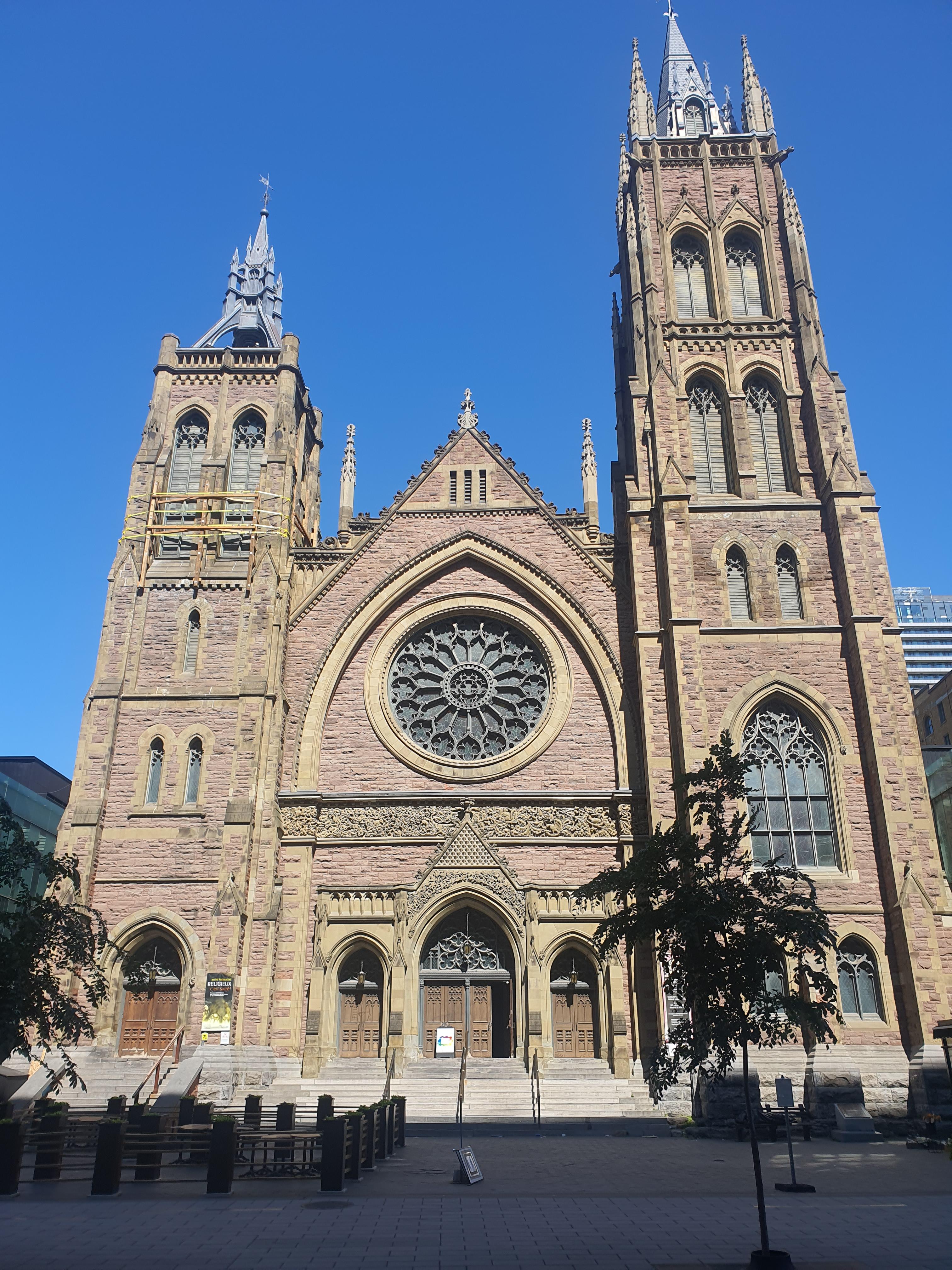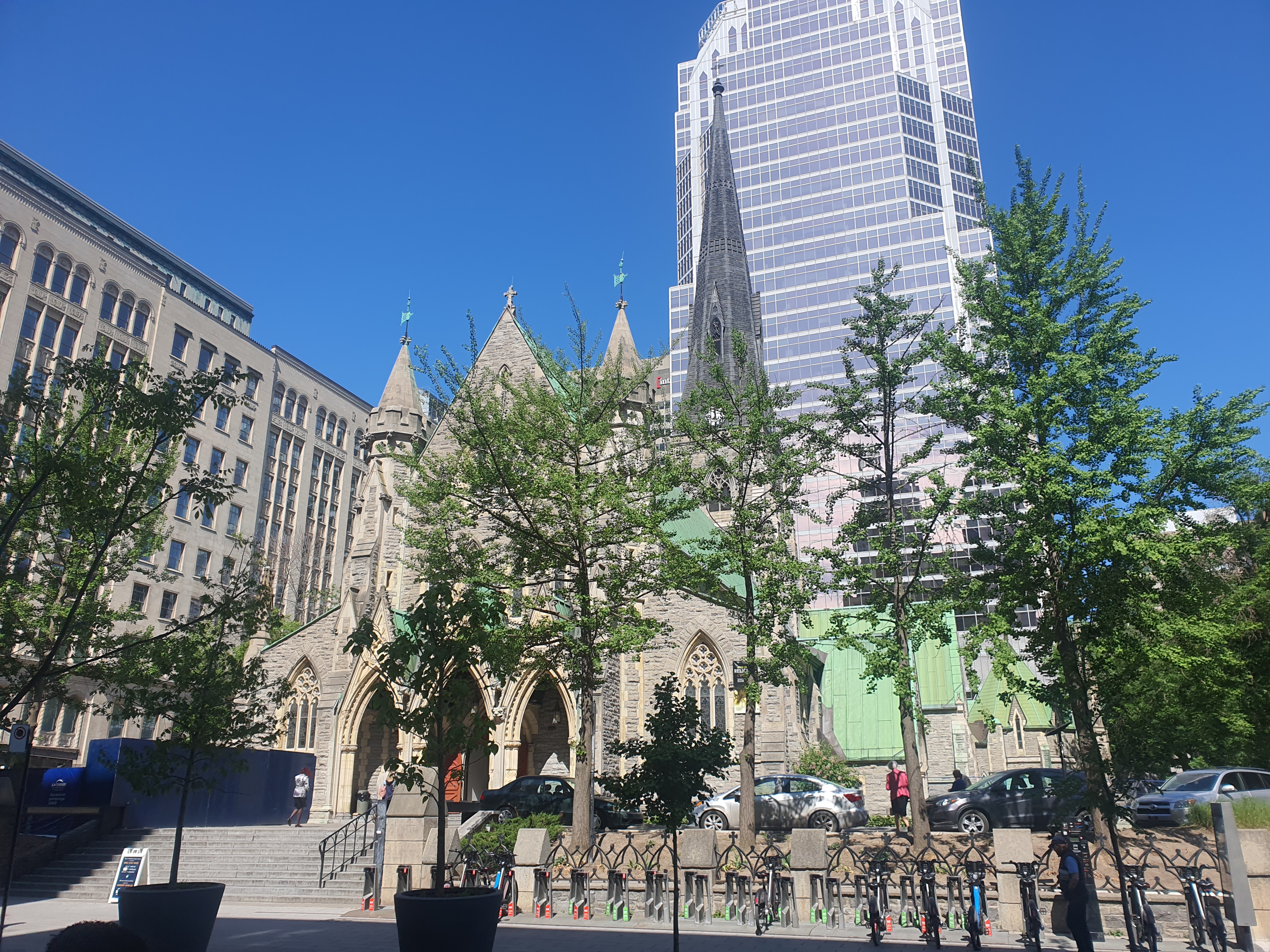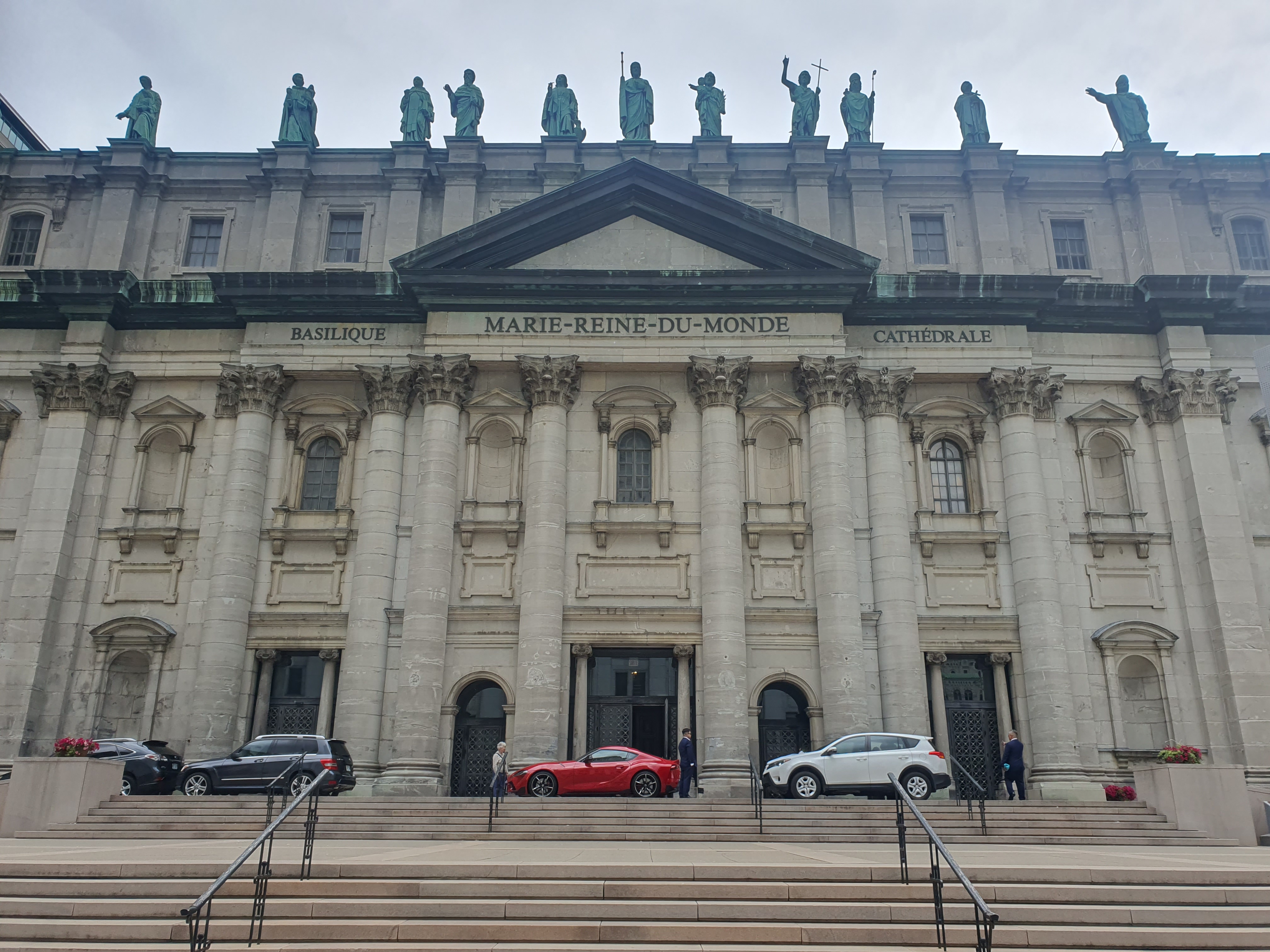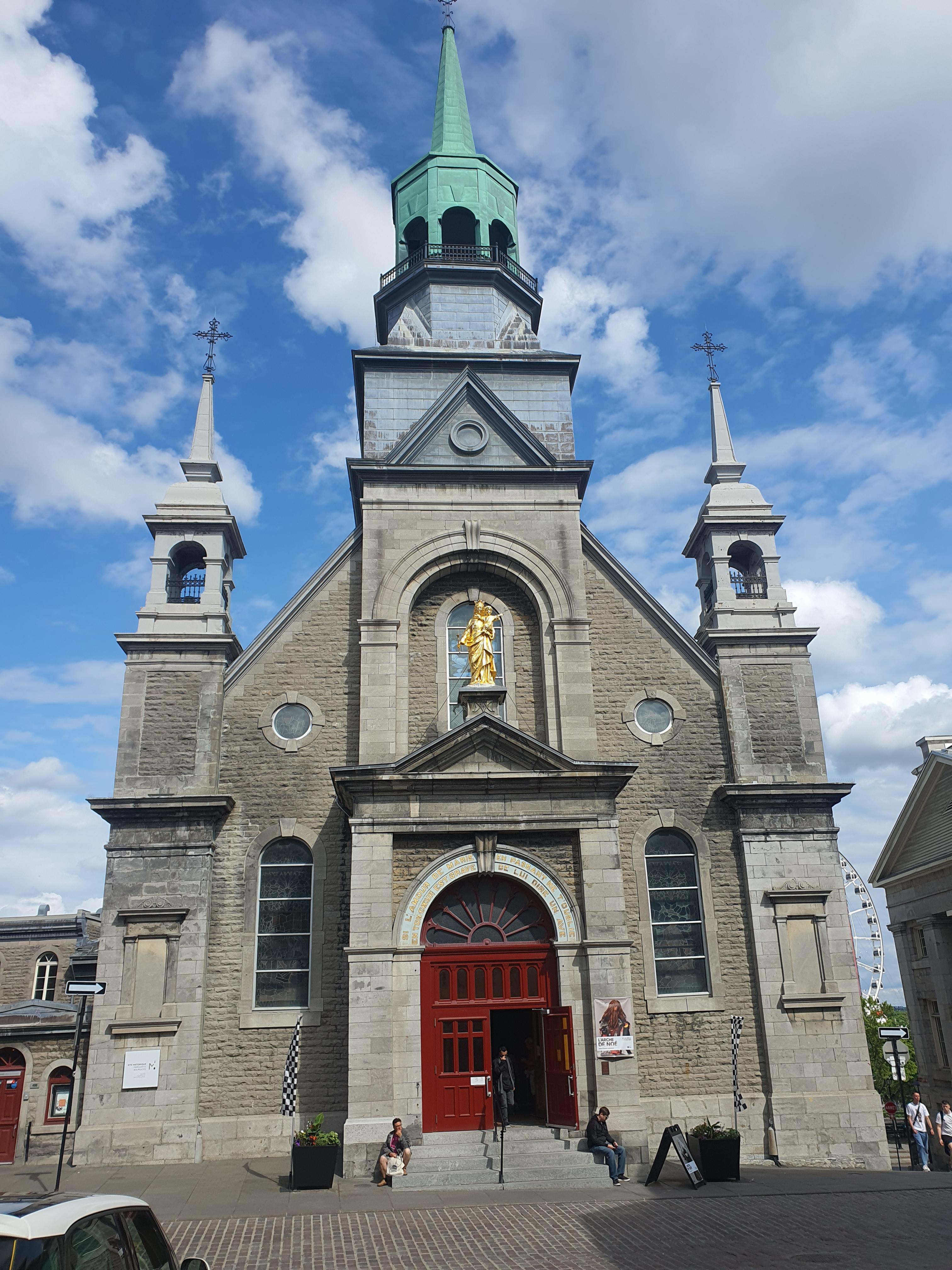 건축은 1875년 에 시작되었고 새 교회는 1894년에 교회가 섬기는 본당의 수호성인 성 제임스 대왕의 이름을 따서 성 제임스 대성당(Saint James Cathedral) 으로 봉헌 되었습니다 . 당시 퀘벡에서 가장 큰 교회였습니다. 1919년 교황 베네딕토 15세 에 의해 작은 대성당이 되었습니다 . 1955년 폴 에밀 레제(Paul-Émile Léger) 추기경의 요청에 따라 교황 비오 12세 에 의해 세계의 여왕 마리아(Mary, Queen of the World)에게 재헌정되었습니다. (교황은 1954년 회칙 Ad caeli reginam 에서 마리아에게 이 칭호를 선포했습니다.) 결혼 예배당이라고 불리기도 합니다. 사진을 찍을 때 결혼식 중이었나 봅니다.