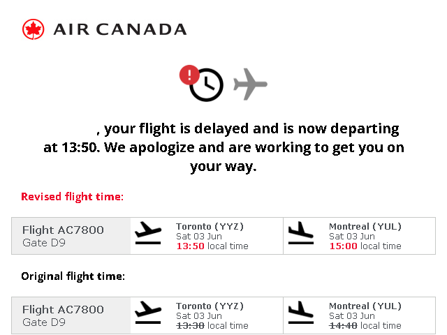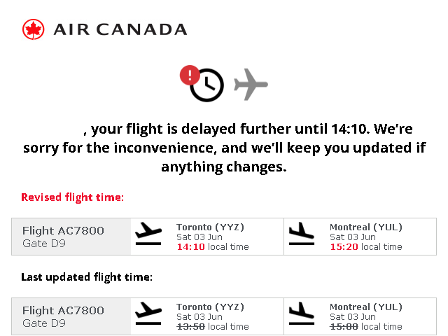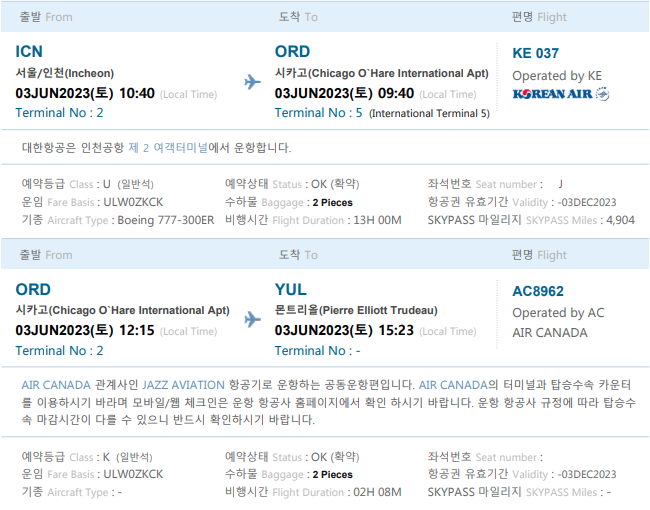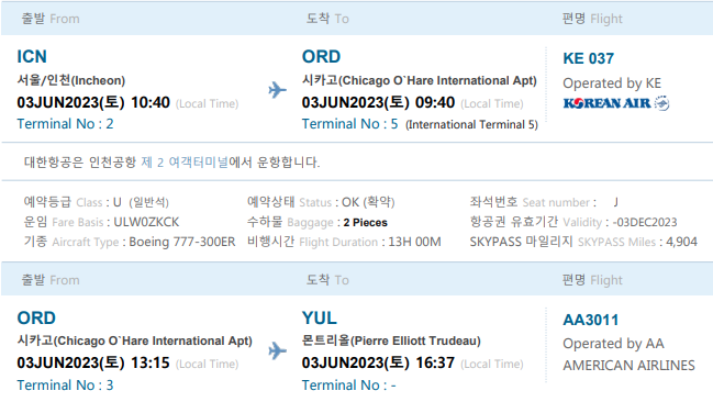미국 시카고에서 캐나다 몬트리올로 가는 비행기 편이 변경되었다며 항공권을 변경해주었습니다.