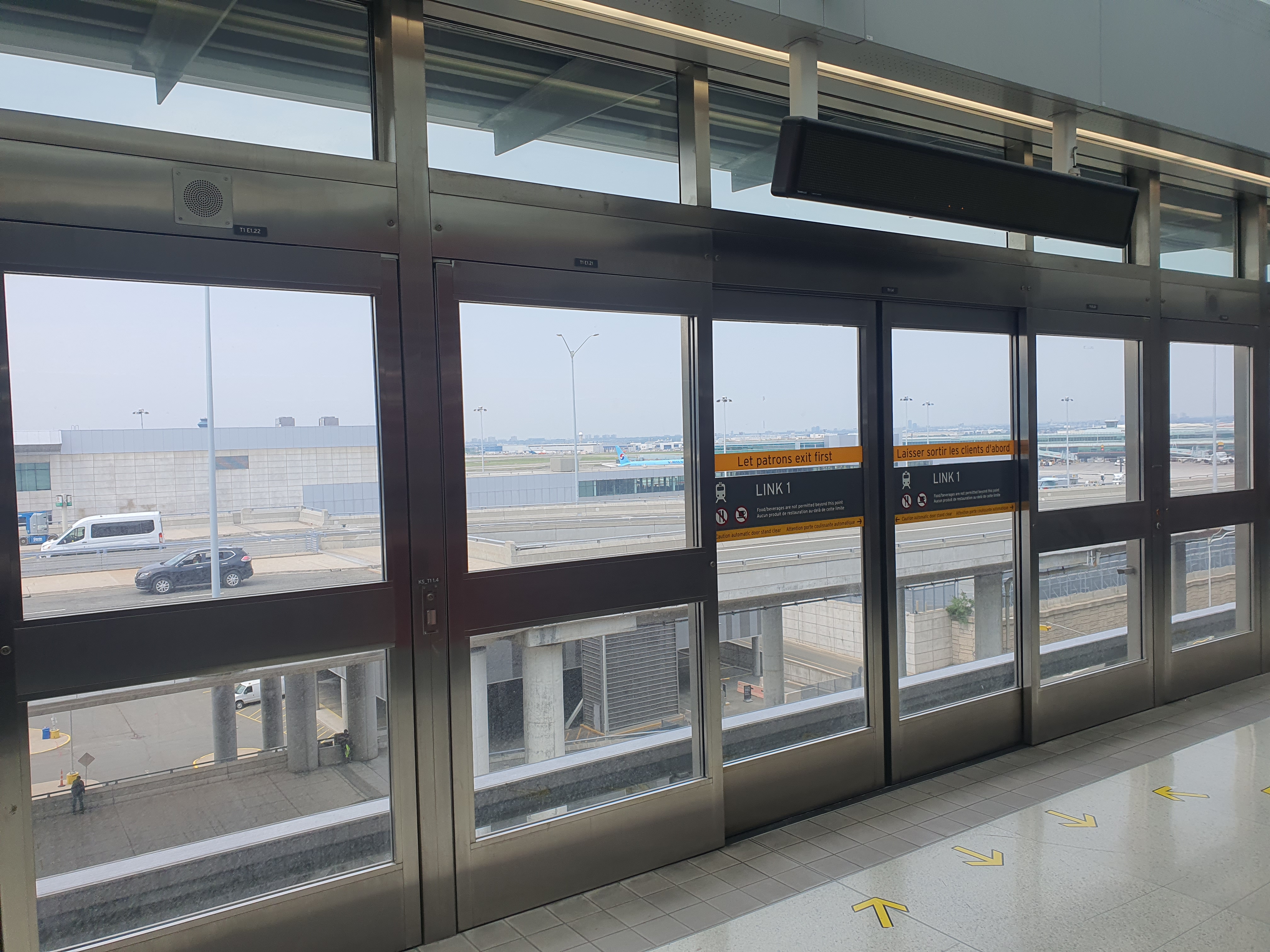 사진은 터미널 1에서 촬영한 스크린도어입니다. 가운데를 중심으로 좌우에 스크린도어가 있습니다.