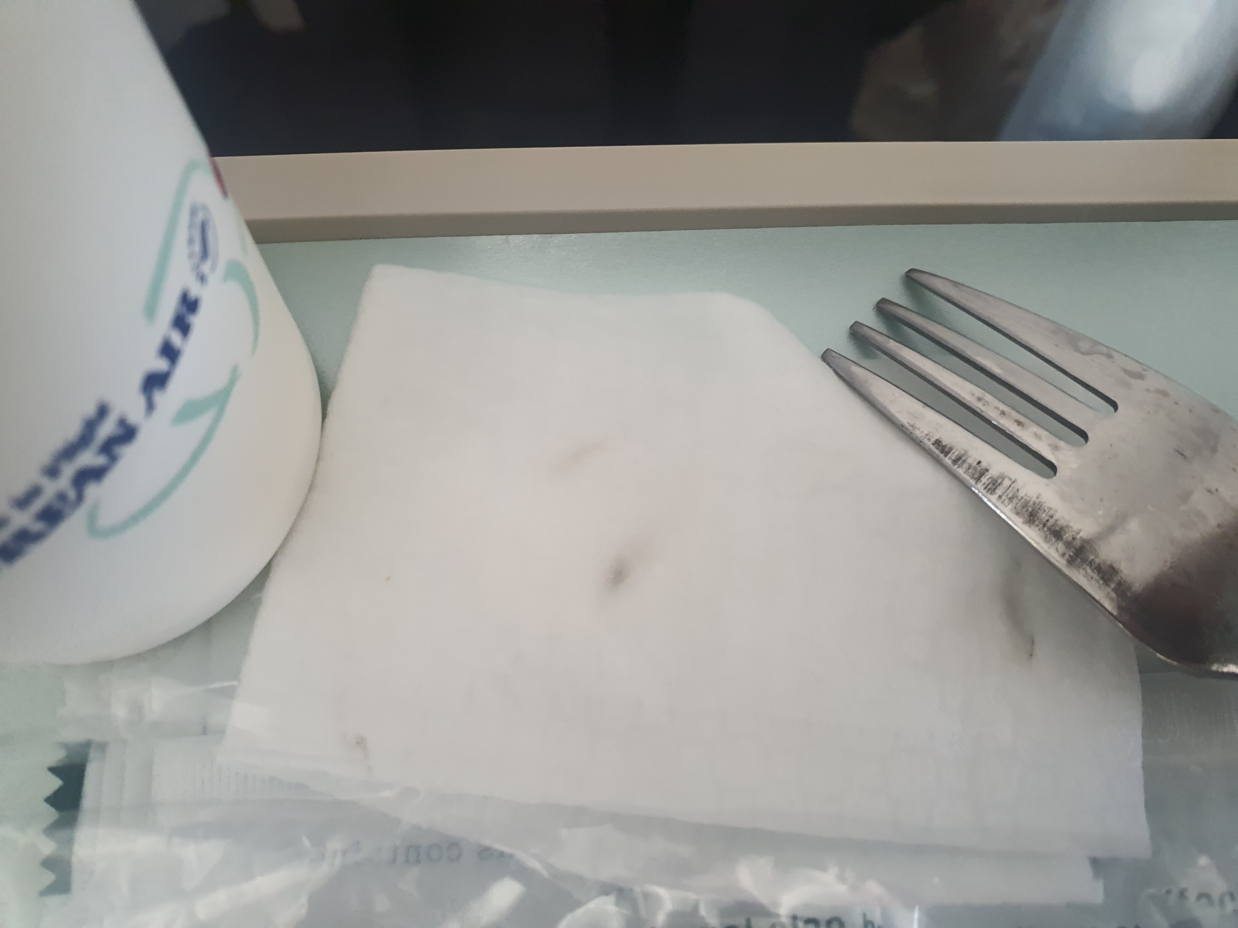 ◎ episode 3 ICN -> Toronto(YYZ)...대한항공 기내식, 음식을 잘 먹고 포크를 뒤집었는데 뭔가 묻어있습니다. 이런건 왜 음식을 다 먹고나서 보이는건지 모르겠는데 포크 끝부분만 깨끗한건 내가 빨아먹어서인지 원래 안묻은건지도 모르겠고...물티슈로 문질러보니 닦이네요...기계 어딘가에서 묻은 기름때 같은데...하청업체 문제죠...
