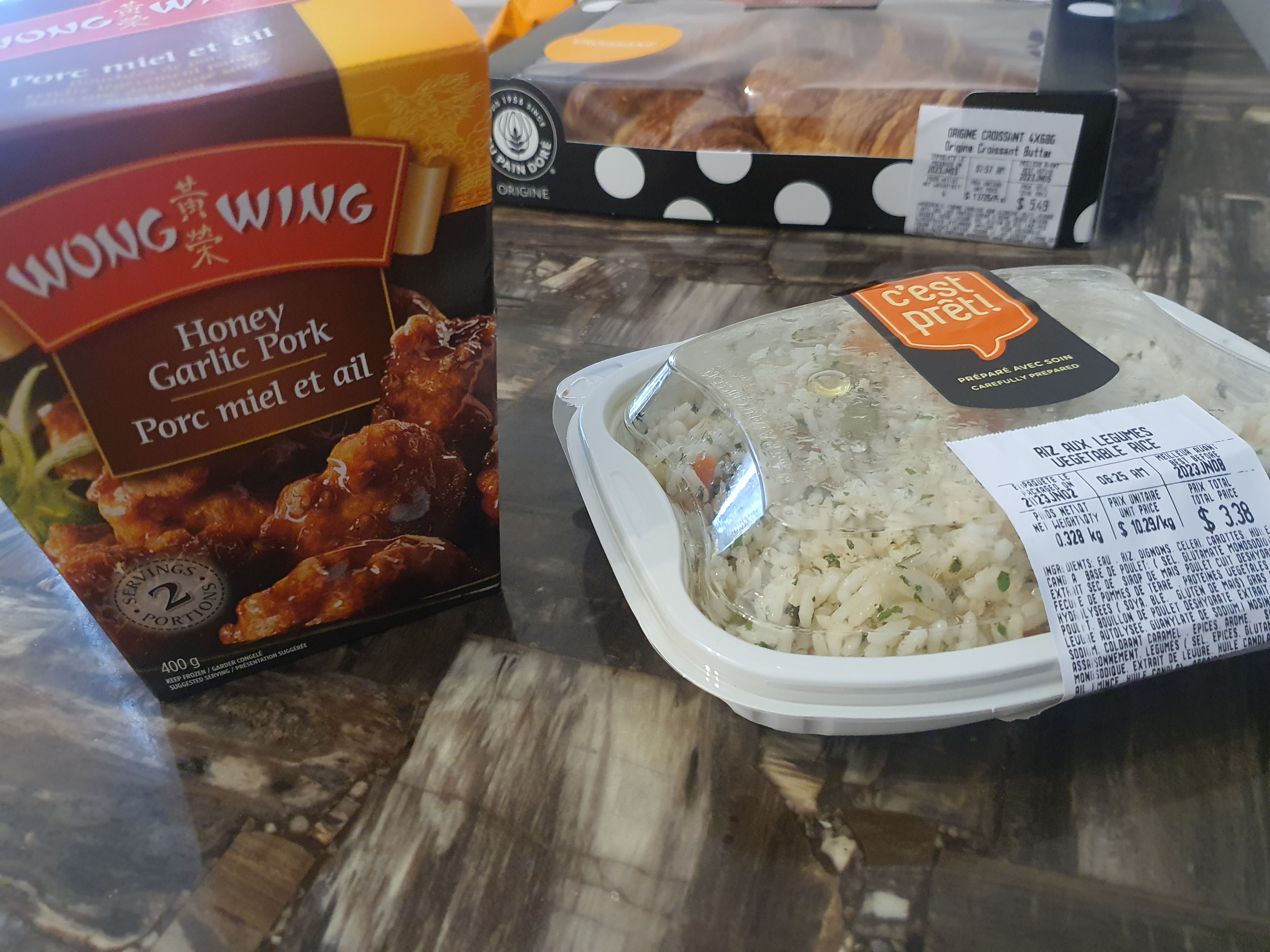 저녁은 IGA에서 compliments LEMONADE(2.79 CAD), riz aux legu(야채볶음밥,3.38 CAD), 허니갈릭포크(wong wing porc miel et ail, 8.49 CAD), 크로아상 한상자(4개, 5.49CAD)를 사왔습니다. TPS 0.14 CAD, TVQ 0.28 CAD 총 20.57 CAD를 체크카드로 결제했습니다. riz aux legu(야채볶음밥), 허니갈릭포크(wong wing porc miel et ail)는 2인분양이라서 후라이팬에 같이 조리를 하고 남은 건 5일 저녁에도 먹었습니다. compliments LEMONADE는 식사 때마다 한컵씩 마셨는데, 느끼함을 잡아주고 좋더군요.