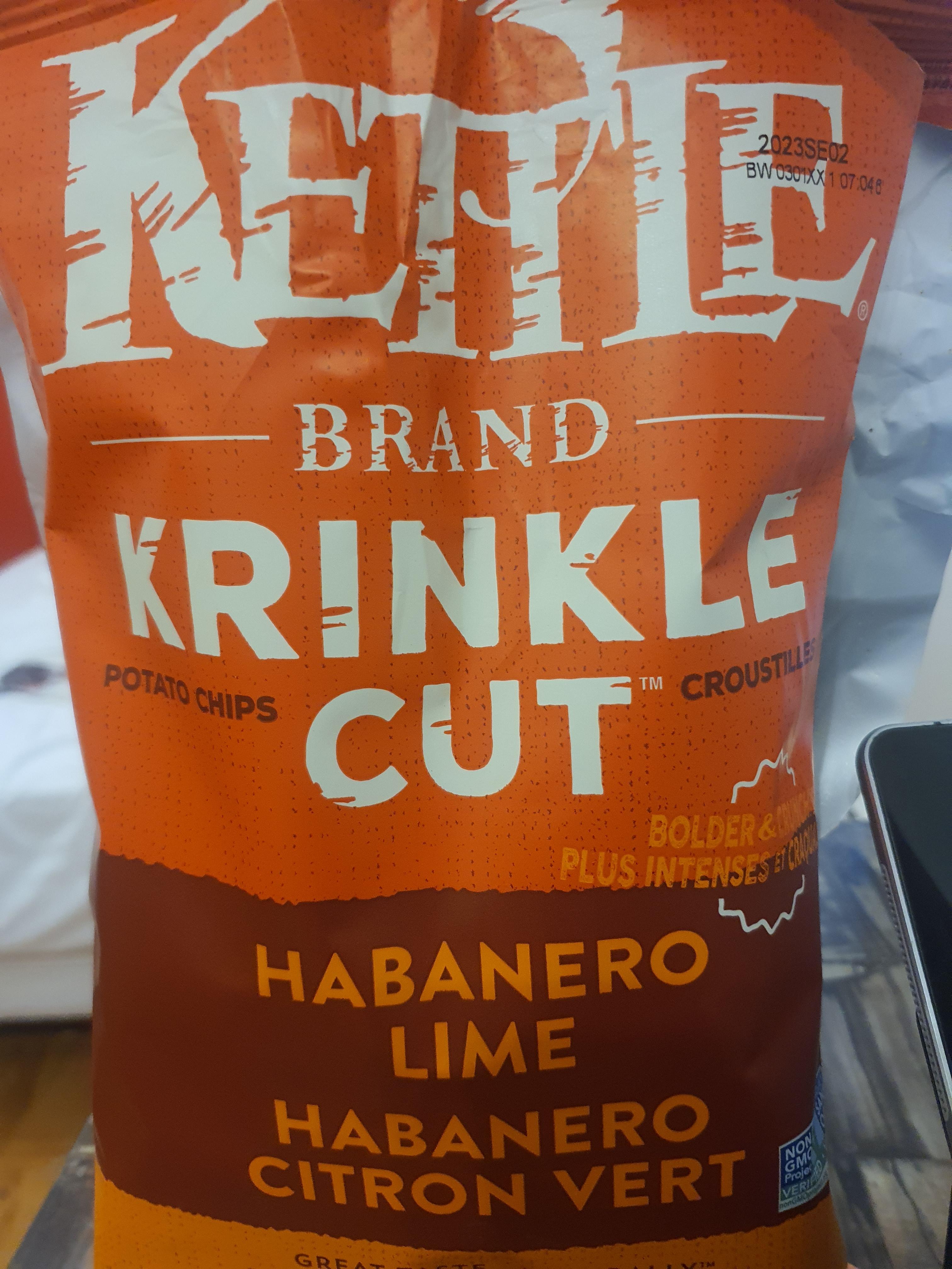 케틀 크링클럿. KETTLE KRINKLE CUT 감자칩(Habanero Lime 하바네로 고추와 라임을 활용한 매콤한 맛) 과자 한봉지를 구매했습니다. 바로 먹지는 않았고 몇일 지나서 먹었습니다. ㅎ