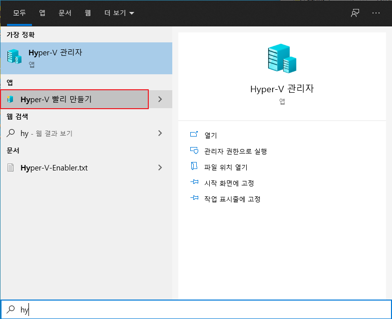 - 시작 메뉴에서 Hyper-V를 검색하여 Windows 11 Home 컴퓨터에서 가상 머신 생성을 시작할 수 있습니다.