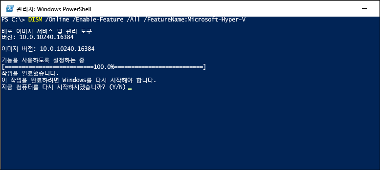 | PS C:\> Disable-WindowsOptionalFeature -Online -FeatureName Microsoft-Hyper-V -All 또는 C:\> DISM /Online /Disable-Feature /All /FeatureName:Microsoft-Hyper-V |