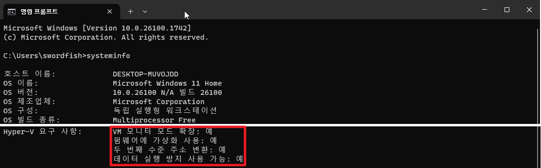 명령 프롬프트 ( 실행(WinKEY+R) –> cmd )를 열고 systeminfo 명령을 실행하여 Hyper-V 요구 사항 섹션을 확인할 수 있습니다.