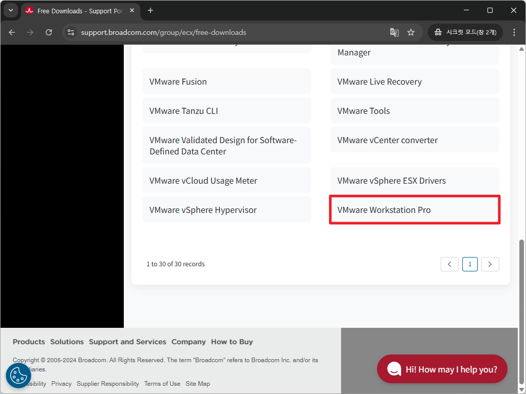 - 오른쪽 화면을 아래쪽으로 이동하여 VMware Workstation Pro를 클릭합니다 .