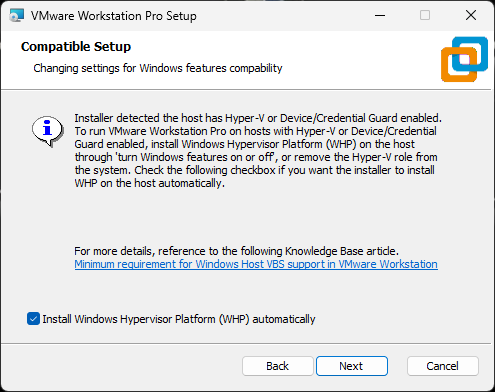 - Hyper-V가 설치되어 있지만 "Windows Hypervisor Platform"(WHP) Windows 기능이 설치되지 않은 경우 "호환 설치" 단계가 표시됩니다. - 이 마법사에서 알 수 있듯이 설치 프로그램은 Hyper-V가 활성화되어 있음을 감지했습니다. 하지만 VMware Workstation이 제대로 작동하려면 위에서 언급한 기능을 설치/활성화해야 합니다. - "Install Windows Hypervisor Platform (WHP) automatically" 상자를 선택하고 다음을 클릭합니다.